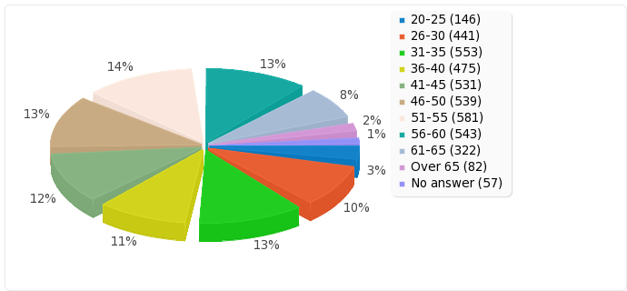 Of all respondents, 56.74% identified themselves as female. However, of the 2,673 (59.8%) respondents who claimed to be employed full-time (>35 hours per week), 53.27% identified themselves as female, while 295 of 433 (68.28%) of those working part-time (20-35 hours per week) are female and 67.16% of those working per diem (less than 20 hours per week) are female. As is shown in Chart 1, the age range is spread rather evenly through all age groups except those at the extreme ends of the range options.