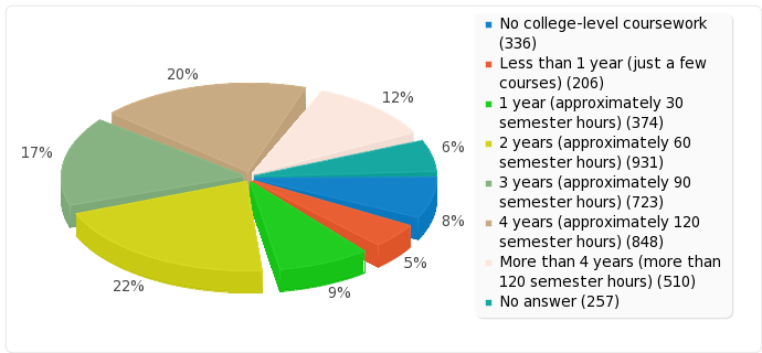 When asked "What is the highest level of formal education you have completed as of this date?", 48.67% claimed to hold a Baccalaureate Degree while another 30.08% claimed to hold an Associate's Degree. Another 9.41% have a Master's Degree and 9.2% hold a certificate of completion or program diploma as their highest level of formal education. Just less than 1% have completed doctoral or post-doctoral education. These data are displayed graphically in Chart 3. When participants were asked whether they are currently in pursuit, or are planning to pursue, additional degree(s), 23.54% said Yes, while 42.52% said No and 23.11% aren't sure.