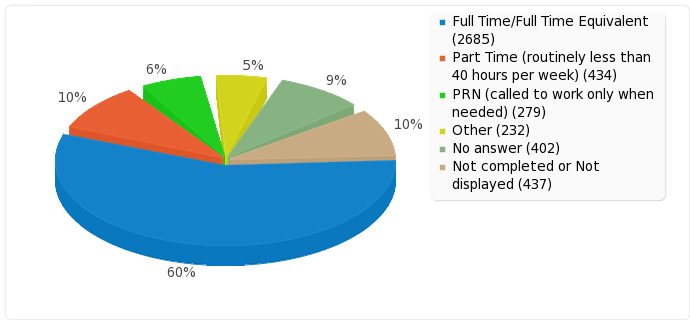 The third section of the 2012 Certificant Survey sought to answer some questions about the employment and job status of nuclear medicine technologists. When asked "Which of the following categories BEST describes your current employment status in a field related to nuclear medicine technology?" 60.08% responded that they were considered full-time or full-time equivalent. Part-timers (routinely less than 40 hours per week) made up 9.71% of respondents, while PRN (called to work only when needed) made up 6.24% of respondents. It may be important to note that 9.0% of survey respondents chose "No Answer" to this question while an additional 9.78% did not respond to this question at all. During the survey, participants were given the option to end the survey after the Certificant/Registry section if they were not employed in a field related to nuclear medicine technology. Also, 5.19% of respondents chose "Other". While a few of those list health care related jobs such as MRI, PACS, Electronic Records, Medical Physics and even an owner of a NM related business, the overwhelming majority of those that chose "Other" stated that they cannot find work in an nuclear medicine technology related field. These data are shown in Chart 6.